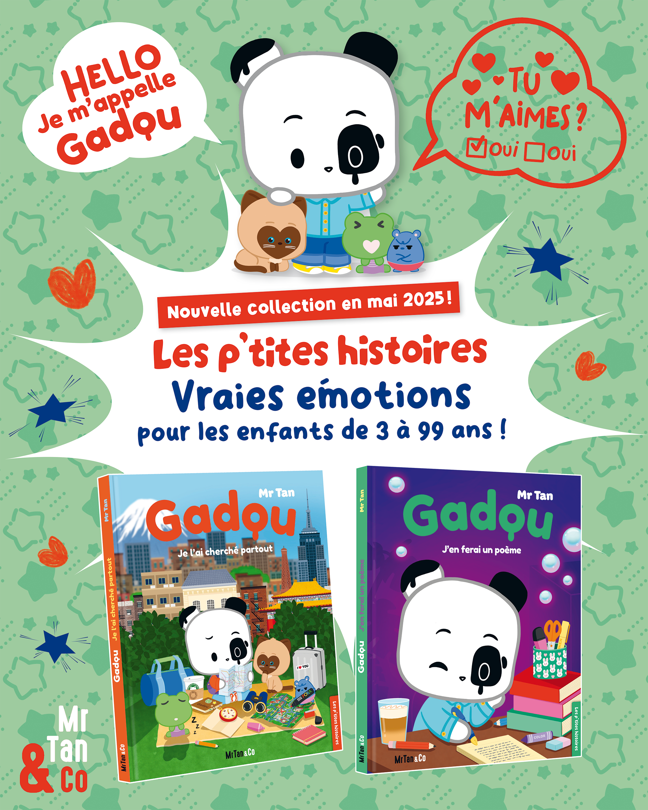 Vous découvrirez des héros riches en couleurs pour explorer la complexité des émotions de notre enfant intérieur. La collection s’ouvre sur deux p’tites histoires de Gadou, le héros des émotions doudous pour aider votre enfant à partir à la rencontre de soi et du monde en douceur ! Les p’tites histoires aux éditions Mr Tan & Co : 🐼 Gadou : « Je l’ai cherché partout » et « J’en ferai un poème »